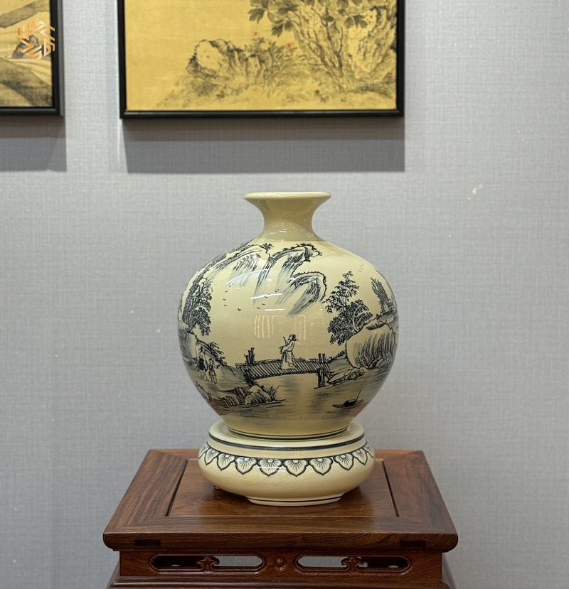 Bình hút lộc Gốm Chu Đậu H40 hoạ tiết đồng quê men gốm truyền thống HLĐQ11