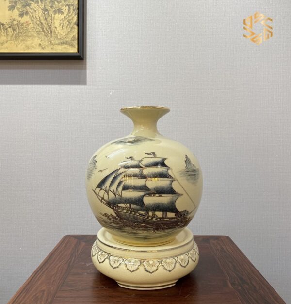Bình hút lộc Gốm Chu Đậu H23 hoạ tiết Vịnh Cảnh Thuận Buồm ý nghĩa vẽ vàng 24k HLVC01