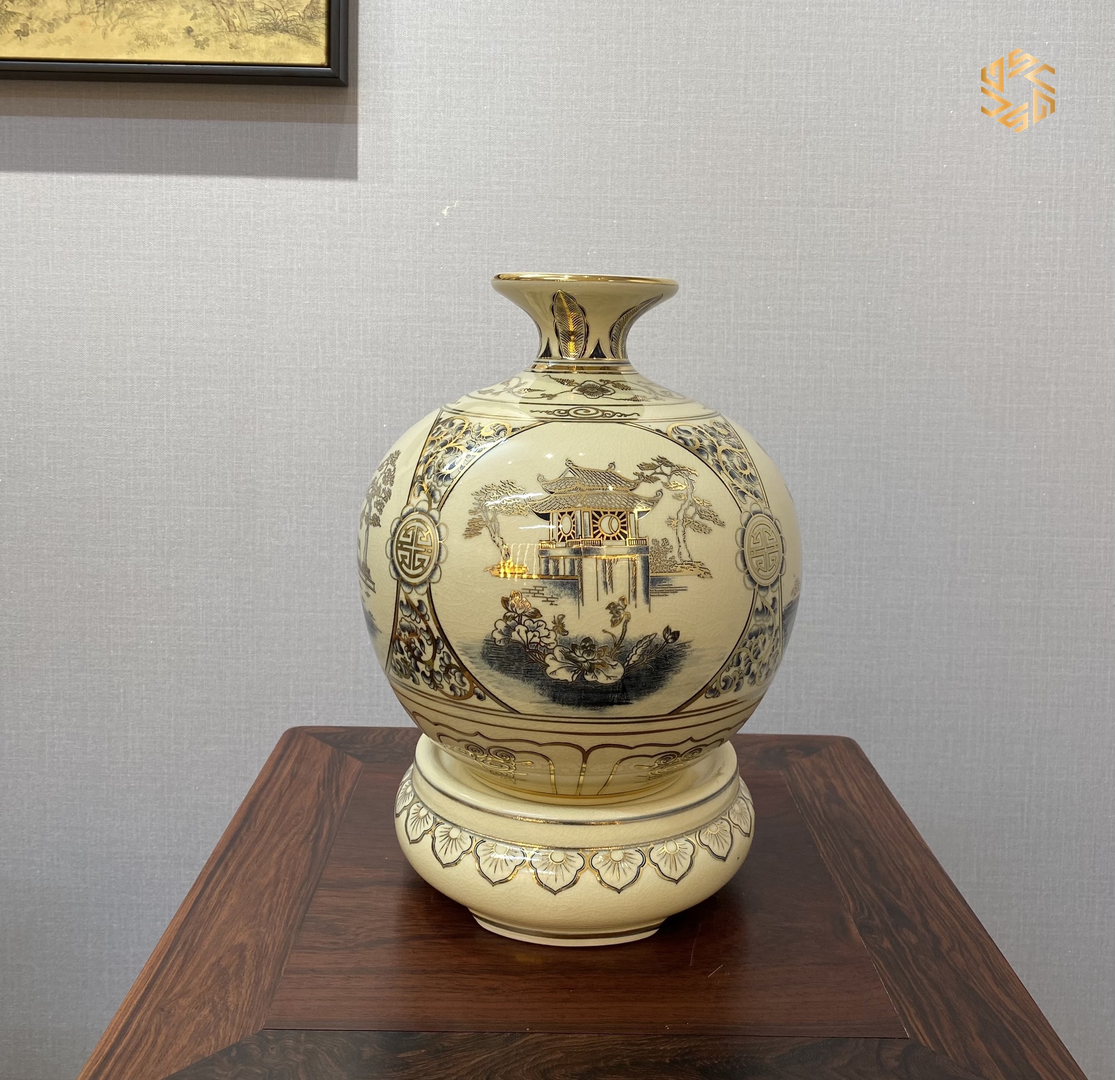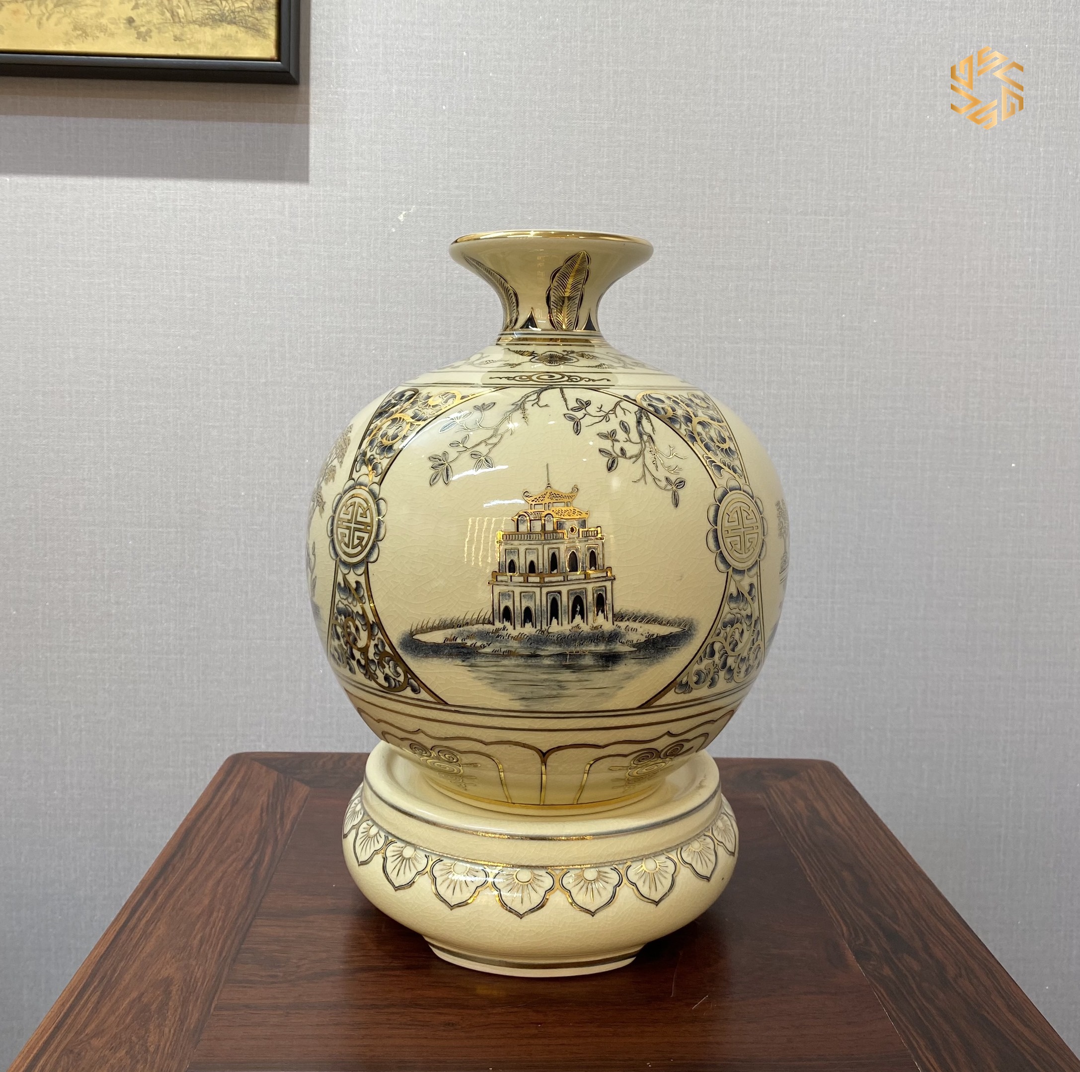 - Bình Hút Lộc Gốm Chu Đậu hoạ tiết tứ cảnh Hà Nội Vẽ Vàng 24K từ làng nghề truyền thống Gốm Chu Đậu nổi tiếng của Việt Nam, là món quà tặng vô cùng ý nghĩa phù hợp trong nhiều trường hợp cụ thể như: Biếu Tặng Sếp – Lãnh Đạo, Tân Gia, Tặng Doanh Nghiệp, Hội Nghị.