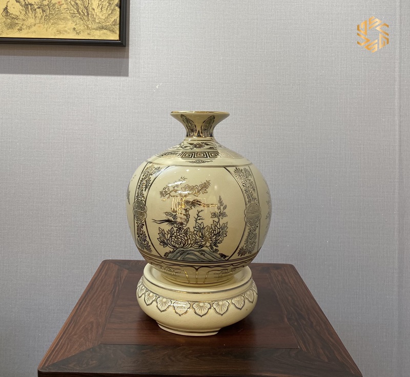Bình hút lộc Gốm Chu Đậu H25 hoạ tiết tùng cúc trúc mai vẽ vàng 24k HLBM02