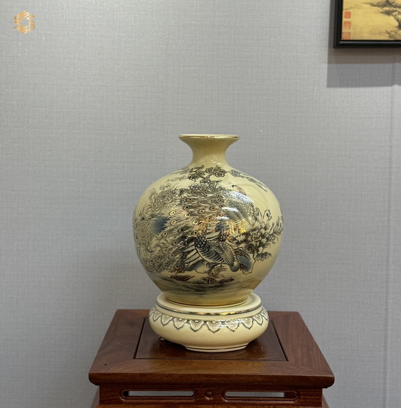 Bình hút lộc Gốm Chu Đậu H30 hoạ tiết chim công hoa đào vẽ vàng 24k HLCĐMĐ03