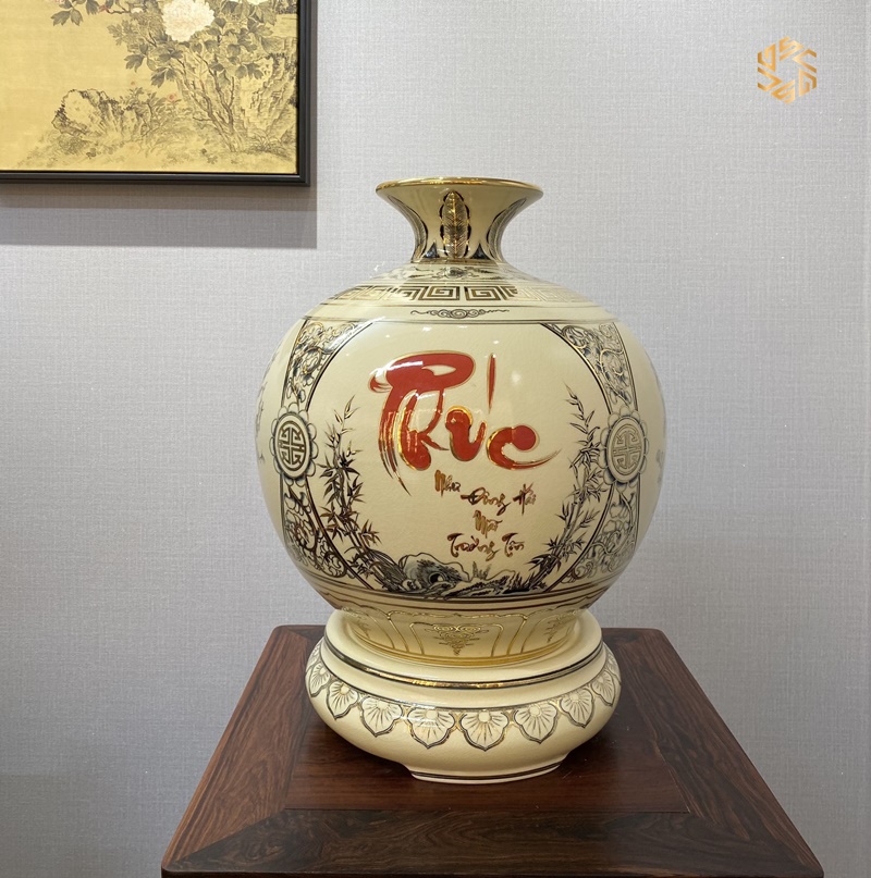 Review Bình hút lộc Gốm Chu Đậu H35 hoạ tiết tứ cảnh chữ PHÚC vẽ vàng 24k HLCP04