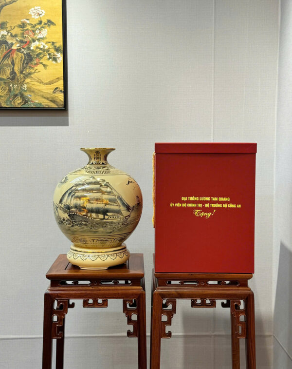 Review Quà Tặng Bình hút lộc Gốm Chu Đậu H40 hoạ tiết thuận buồm – công đào vẽ vàng 24k BHLCĐ05