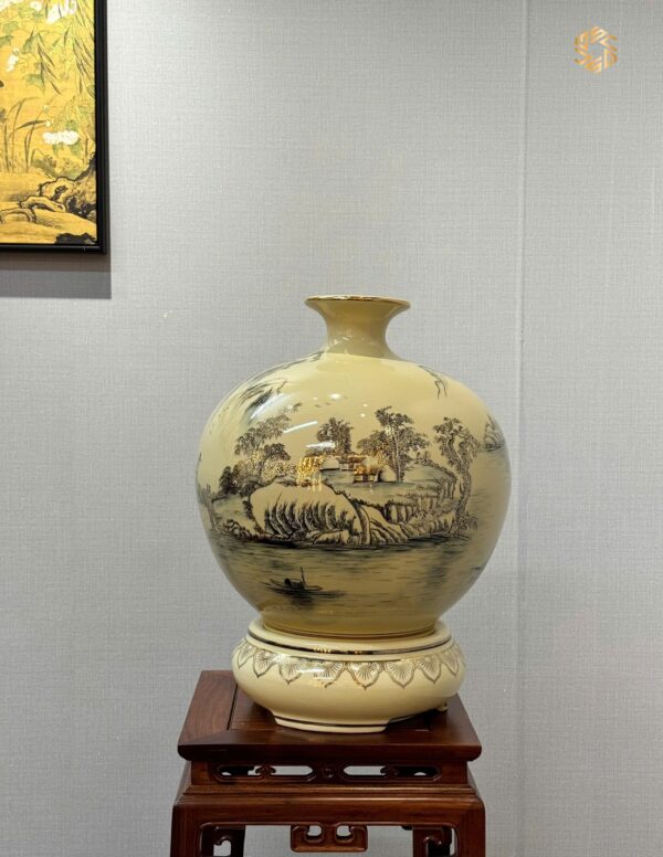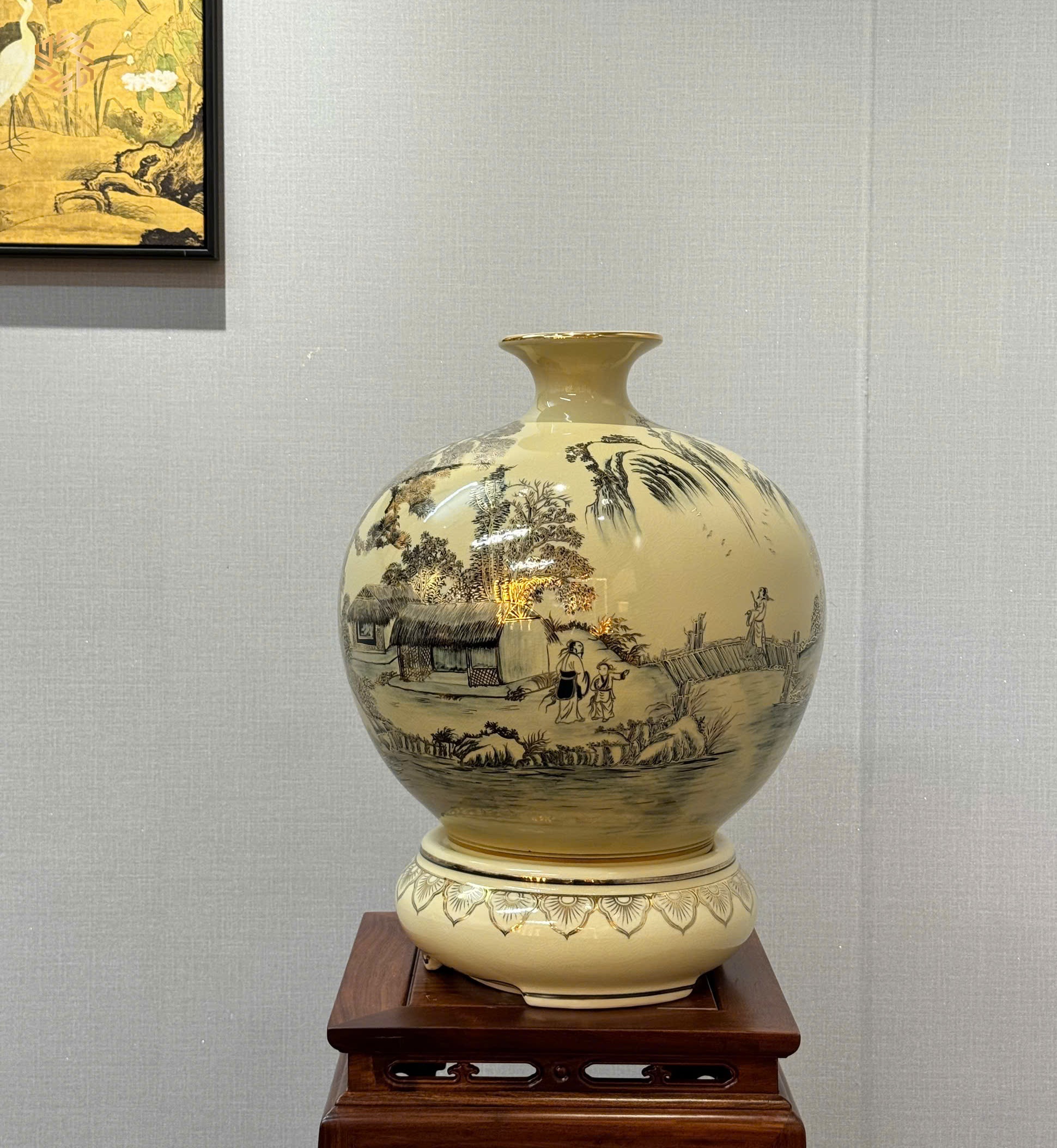 Bình hút lộc Gốm Chu Đậu H45 hoạ tiết Sơn Thuỷ Đồng Quê ý nghĩa vẽ vàng 24k HLSQ06