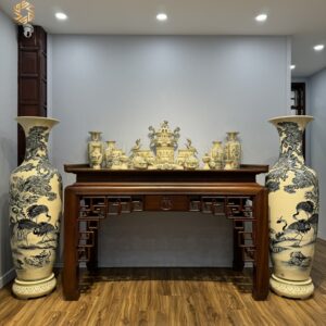 Bộ đồ thờ Gốm Chu Đậu vẽ vàng 24k kết hợp cùng Lộc Bình Tùng Hạc truyền thống ban dài 175 cm – 217 cm CB7