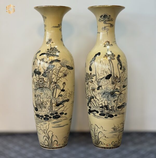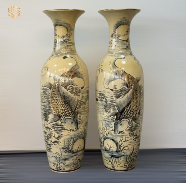 Lộc Bình Gốm Chu Đậu H120 hoạ tiết Lý Ngư Vọng Nguyệt vẽ vàng 24k LBLN01