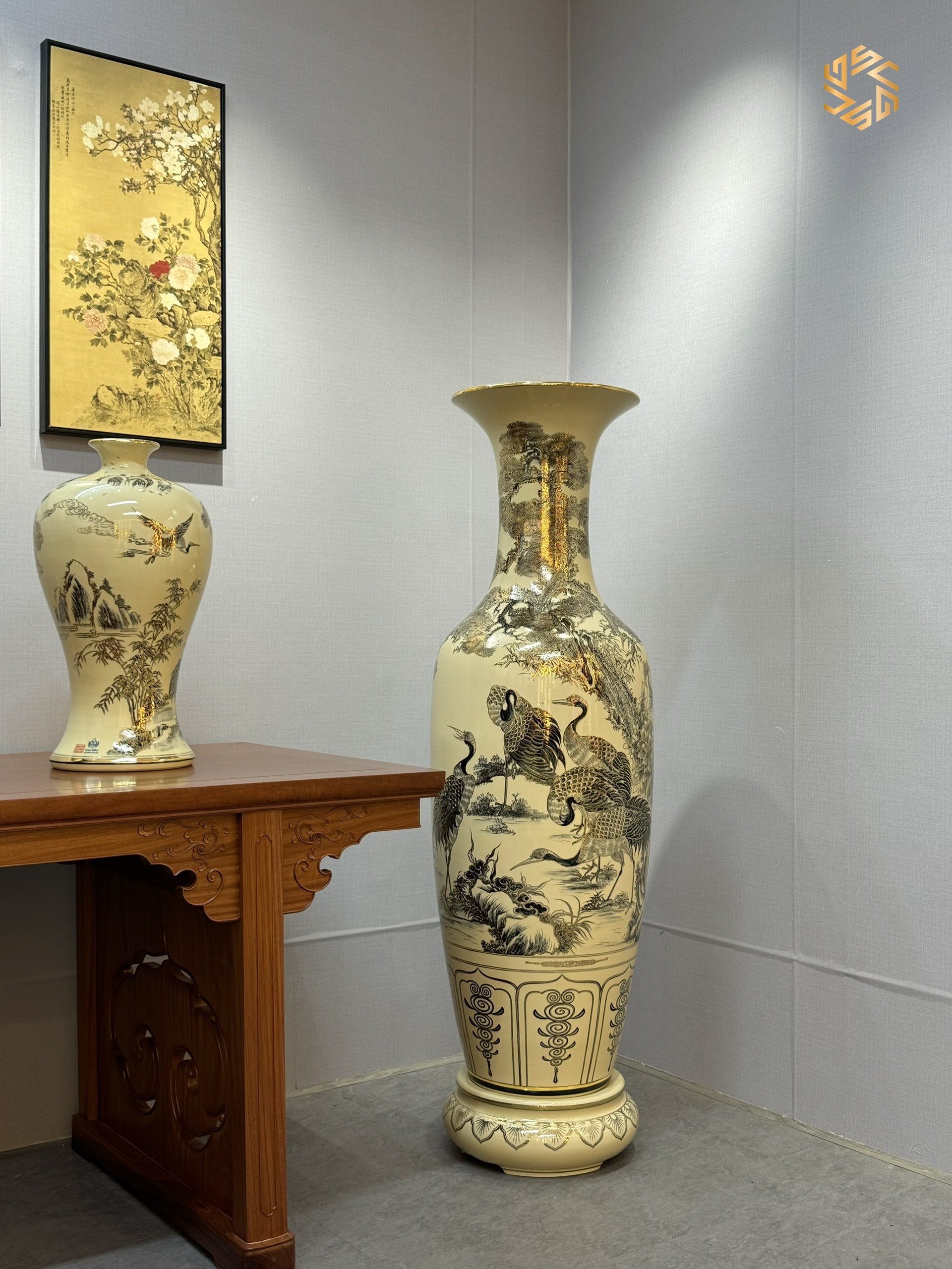 Review Lộc Bình Gốm Chu Đậu 1M65 hoạ tiết Tùng Hạc vẽ vàng 24k LBTH03